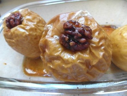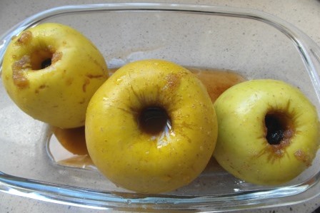 Colocamos las manzanas en una fuente que podamos meter en el horno. En el hueco de las manzanas echamos unas cuantas pasas.