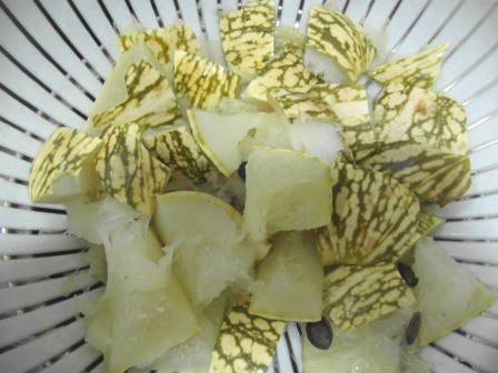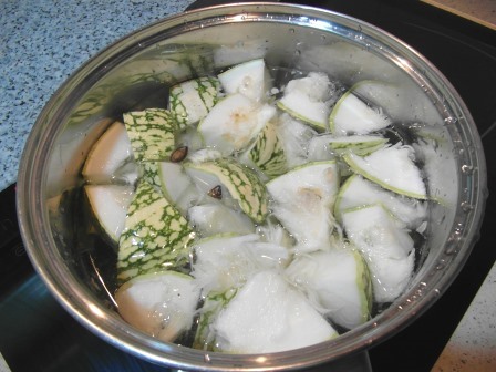 Se corta en trozos la calabaza de sidra y se ponen a cocer en una olla con agua.