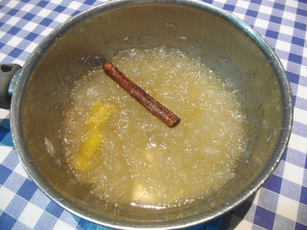 Ponemos a cocer agua con el azúcar, la canela y el limón para hacer un almíbar, y añadimos la pulpa hasta que quede en el punto del cabello de ángel, acaramelado.