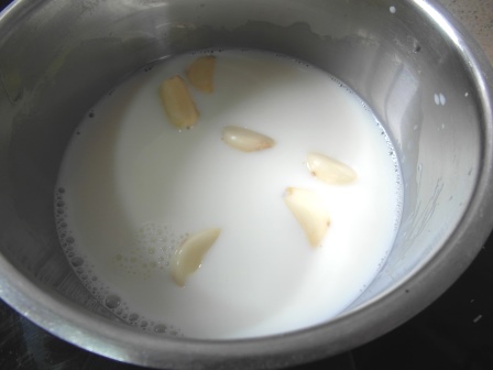 Ponemos a hervir en un cazo los dientes de ajo con la leche. Se sacan los ajos y se diluye en la leche la levadura.
