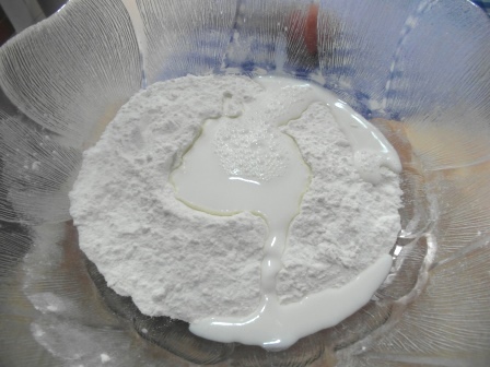 En un cuenco se pone la harina con un poco de sal y un pellizco de azúcar. Se añaden los ajos triturados y el aceite, mezclando bien.