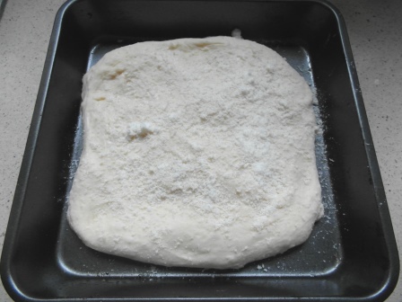 Damos forma al pan en forma de un rectángulo y lo colocamos en la bandeja del horno y lo dejamos reposar una media hora, tapado con un paño de cocina.