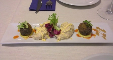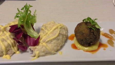 Comenzamos con unas Delicias de morcilla con con coulis de mango, a modo de croquetitas, deliciosos bocados. Y acompañadas de ensaladilla hecha con las patatas del puchero lo que la hacía muy sabrosa y rica.