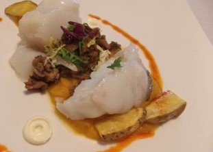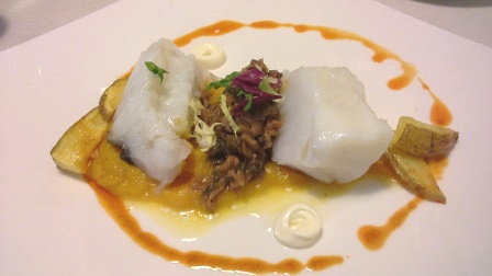 Pues este último vino nos sirvió para acompañar un Bacalao sobre guiso de chipirones, con una base de puré de calabaza, y acompañado de patatas con alioli.