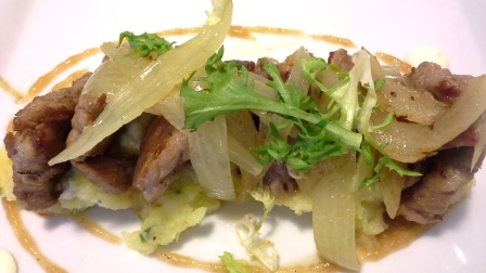 En este plato se puede notar el efecto positivo del horno de leña, en este caso sobre la carne, que comentábamos antes, y no os podéis imaginar cómo están esas patatas mezcladas con el alioli y la carne de membrillo, porque así es como hay que tomarlo, todo mezclado.