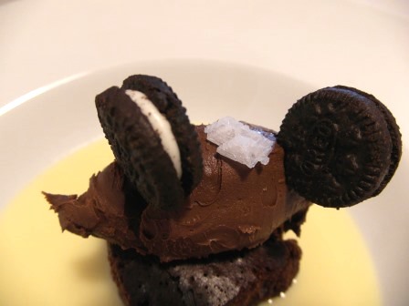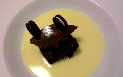 Ya solo nos queda el postre que no tuvo nada que envidiarle a sus predecesores salados…Brownie hecho en el horno de leña sobre sopa de chocolate blanco, con crema de chocolate negro y un detalle especial, pirámides de sal de las salinas de Iptuci en Prado del Rey.