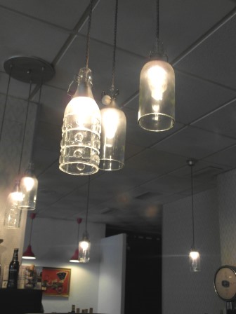 Objetos reciclados como las “lámparas” de la barra, que son botellas de las que imitan a las de La Casera, cortadas por ellos mismos por la parte inferior. Objetos antiguos como aparatos de radio o máquinas de escribir…