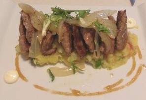 Y como último plato, antes del postre, Presa de cerdo ibérica asada al horno de leña sobre patatas rotas aliñadas, con alioli y carne de membrillo.