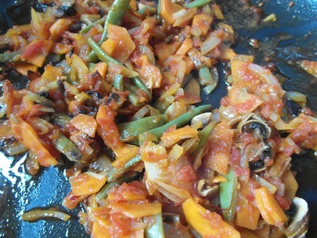 En una sartén grande con aceite de oliva refreir los ajos picados, las judías verdes y la zanahoria.