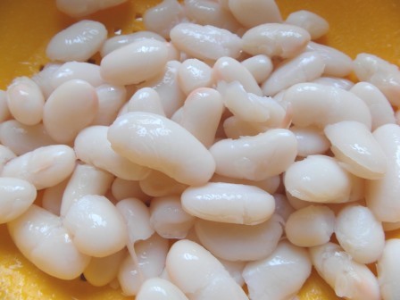 Sacar las habichuelas o judías blancas del bote y enjuagarlas bien debajo del grifo en un colador.