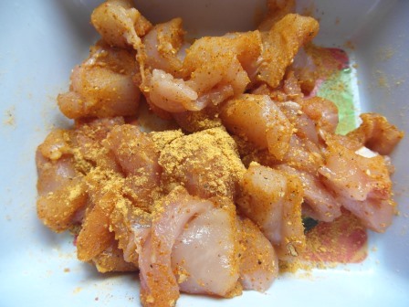 Mezclar el pollo en un cuenco con el condimento para Burritos y dejarlo reposar. Este sazonador también le da color, no hace falta añadir colorante.