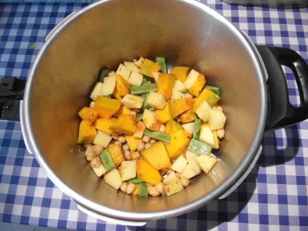 En la olla rápida se ponen las verduras y la patata peladas y cortadas.