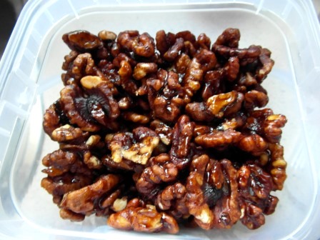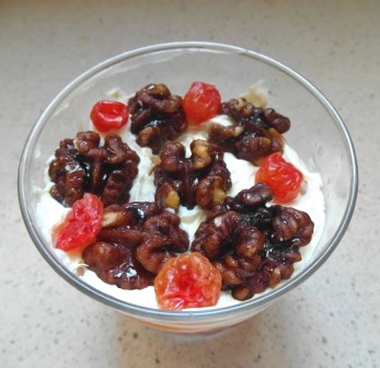 Acabamos poniendo más queso y adornando la superficie con nueces caramelizadas (las venden en tarrinas en Makro por ejemplo), y otros frutos o frutas secas que tengamos.