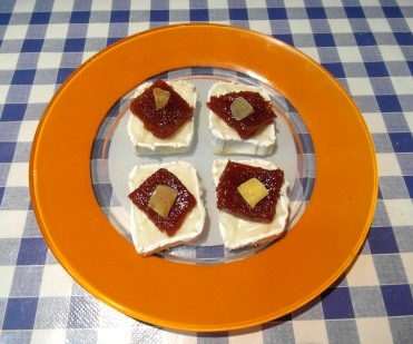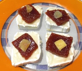 Colocamos el membrillo sobre el queso y lo adornamos con un trocito de fruta seca, en este caso mango, pero podemos usar almendras, nueces…lo que tengamos a mano.