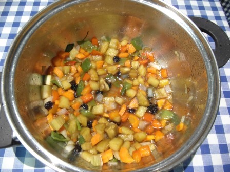 Rehogarlas en aceite de oliva hasta que estén doraditas, añadir el vino y dejar unos minutos, dos o tres, y a continuación el caldo de pescado. Añadir la sal, la pimienta, la soja y las pasas.