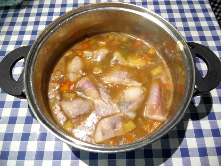 Disolver la harina de maíz en un poco de agua y añadirlo al resto, para que se espese un poco. Dejar hervir unos minutos a fuego no muy fuerte.