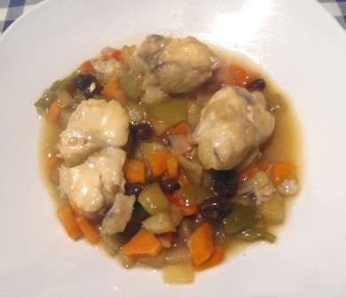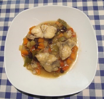 Un rico plato de pescado con verduras y con un toque un poquito dulzón que le proporciona el vino.