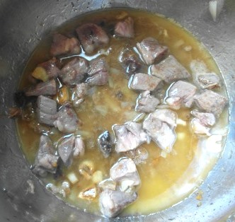 En la olla, sartén o cazuela donde vayamos a hacer el arroz echamos aceite de oliva en el fondo y refreímos un poco los ajos. Añadimos la carne y la refreímos con los ajos. A continuación echamos la salsa que tenemos preparada.