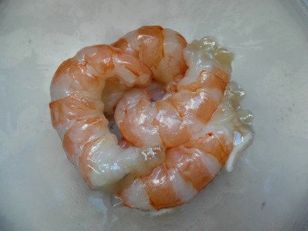Hervimos en agua con sal las cabezas de los gambones y colamos el agua. La reservamos. Pelamos las colas de los mismos y las reservamos también.