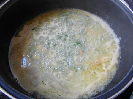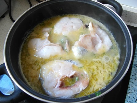 Añadimos los gambones pelados y dejamos hervir todo, hasta que veamos que la merluza ya está hecha.