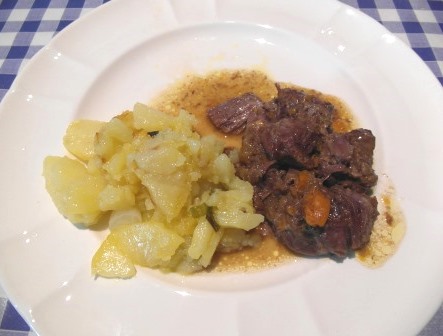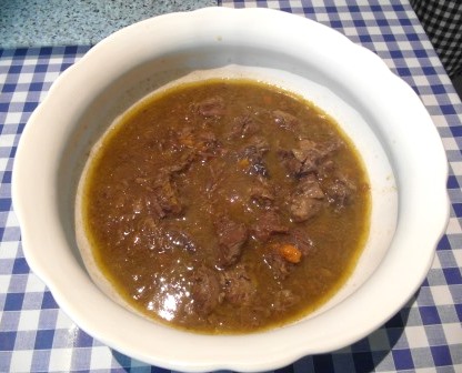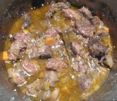 En el mismo aceite (o un poco más si lo vemos necesario) echamos las verduras, el ajo y el laurel. Cuando esté dorado añadimos el vino tinto y el caldo. Cuando hierva un poco añadimos la carne, y lo dejamos hacer con la olla tapada unos 15-20 minutos. La carne debe estar tierna al pasar este tiempo, si no se deja un poco más.