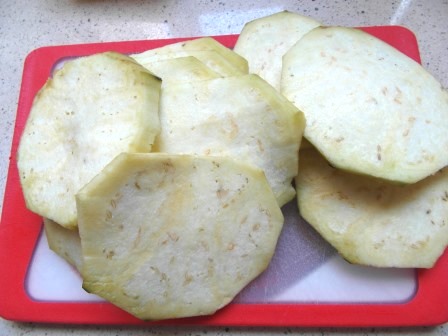 Pelamos la berenjena y la cortamos en rodajas finas. Las berenjenas conviene echarlas en un cacharro plano con leche que las cubra durante una media hora, para que pierdan el amargor.