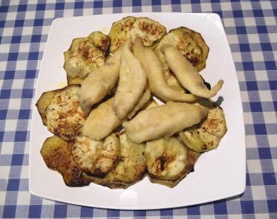 Pues bien, ya sabemos que los fritos bien hechos no son malos y por ello hoy voy a publicar un plato que consta de dos productos fritos, gallo y rodajas de berenjenas.