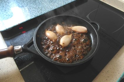 En el mismo aceite pasamos un poco los chipirones, añadimos una cucharada de salsa de soja y seguimos pasando los chipirones, que tomarán un atractivo color tostado.