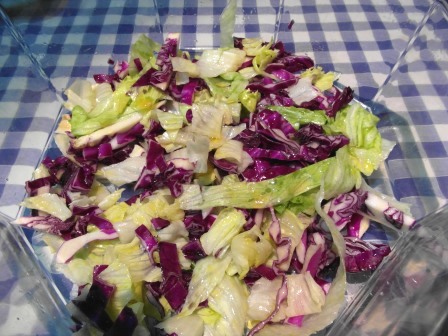 Cortamos la lechuga y añadimos la col ya remojada. Aliñamos todo en un cuenco, con sal, vinagre y aceite de oliva, en este orden.