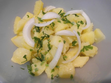 En primer lugar cocemos las patatas hasta que estén tiernas. Cuando aún no se hayan enfriado del todo las pelamos y cortamos en trozos. Las ponemos en un cuenco con cebolla y perejil cortados. Las probamos de sal y añadimos vinagre y aceite de oliva generosamente.