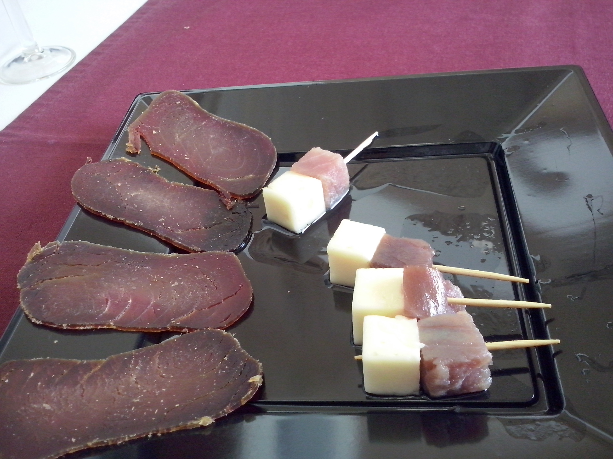 Ricardo nos presentó sus Pimientos asados con huevos y chanquetes, para chuparse los dedos. Y unos pinchitos de atún con mermelada hecha con el macerado del atún y acompañados de cuscus. Buenísimos.