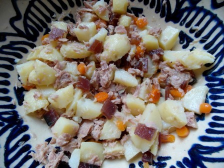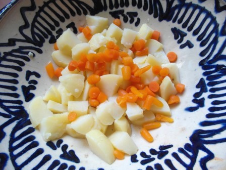 Comenzamos haciendo una ensaladilla de las de siempre, en este caso con patatas y zanahoria cocidas, pero se pueden añadir, por ejemplo, guisantes.