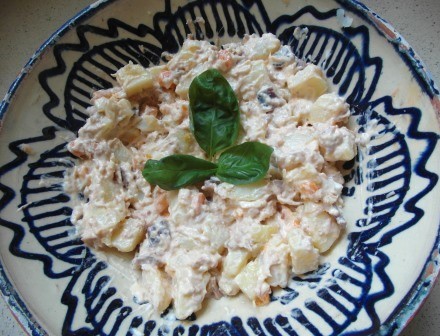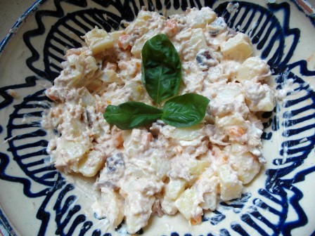 En esta ocasión he usado algunas lonchitas de mojama para hacer una ensaladilla, con la novedad de añadirle pimentón a la mayonesa. El resultado es espectacular.