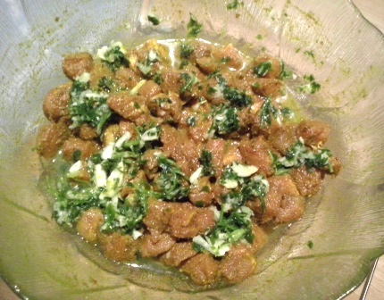 En un cuenco colocamos la carne y la mezcla del mortero, se mueve para que la carne tome el sabor por todas partes, y se deja un día o una noche en el frigorífico, tapado con papel film o una tapadera.