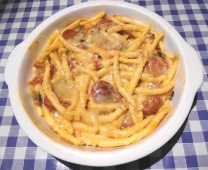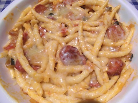 Ya está, listo para comer…El queso se ha derretido y la mezcla con la pasta, el pisto y las salchichas dan como resultado un plato exquisito.