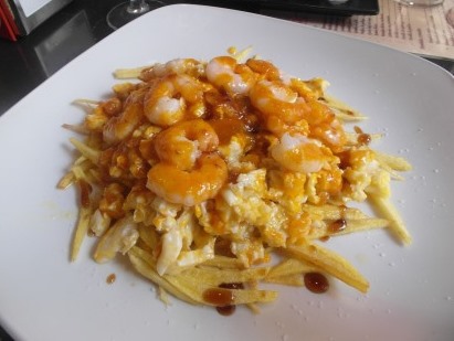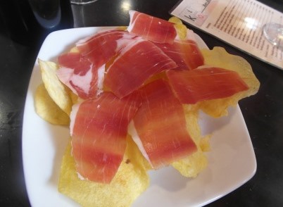 Las famosas patatas chips que fríen ellos mismos, finas y crujientes, acompañadas de jamón. Esto para abrir boca.