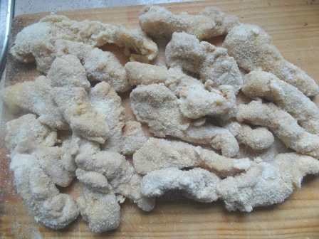 El día siguiente empanamos los trocitos de pollo, pasándolos por harina, huevo batido y pan rallado en este orden.