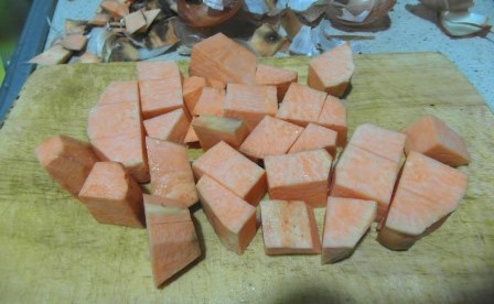 Pelamos y cortamos las patatas y los boniatos en cubos.