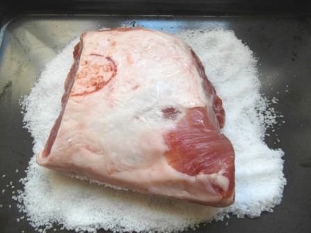 Se cubre el lomo por debajo y por encima con sal abundante y se mete en el horno precalentado a 200º.