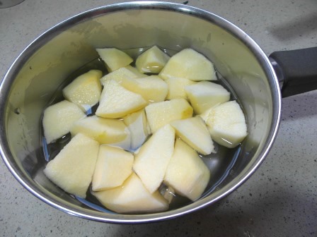 Pelamos y cortamos la manzana en trozos, y la ponemos a hervir en agua con la rama de canela y el azúcar.