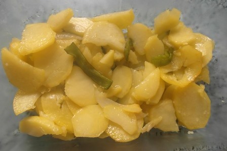 En una sartén con aceite pochamos el pimiento y la cebolla, y a continuación las patatas. Echamos sal a gusto. El aceite no debe estar muy caliente, para que no se frían.