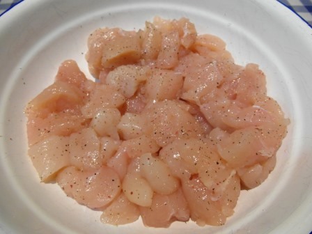 Cortamos el pollo y lo sazonamos con sal y pimienta molida.