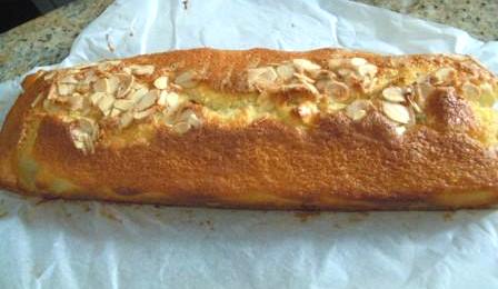 Se van mezclando todos los ingredientes poco a poco, menos las almendras que son para decorar. La masa debe quedar muy homogénea y bien ligada. Se echa en un molde tipo plum cake forrado de papel de horno. Lo decoramos por encima con almendras laminadas. Se hornea a temperatura media para que no se queme por fuera y quede crudo por dentro.