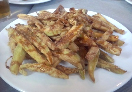 Otro plato destacable son las Berenjenas fritas con miel de caña, cortadas muy finas y muy bien fritas, crujientes y buenísimas.