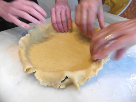 Estiramos la masa con un rodillo, procurando que no se rompa, hasta obtener un círculo mayor que el molde, que debe ser de 24 cm. de diámetro. Pasamos por encima un rodillo punteador, para que no suba.