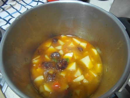 Cortamos los chorizos en rodajas y los añadimos a continuación, así como el pimentón y la sal. Cubrimos de agua y lo ponemos al fuego, unos 20 minutos en olla rápida.
