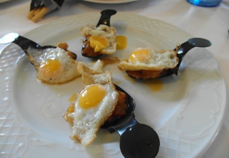 Petri nos fue poniendo algunos platos para que probáramos varios, no todos pues la carta es muy amplia, pero sí pudimos dar cuenta de platos tan ricos como estos. Todos elaborados con productos de la zona, de primera calidad. Para abrir boca empezamos con un aliño y unas cucharitas de estas que ahora se usan mucho en los bares y restaurantes.