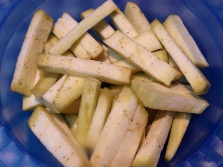 Sencillamente pelamos las berenjenas, las cortamos como las patatas, en palitos, las salamos y las freímos, también como las patatas.