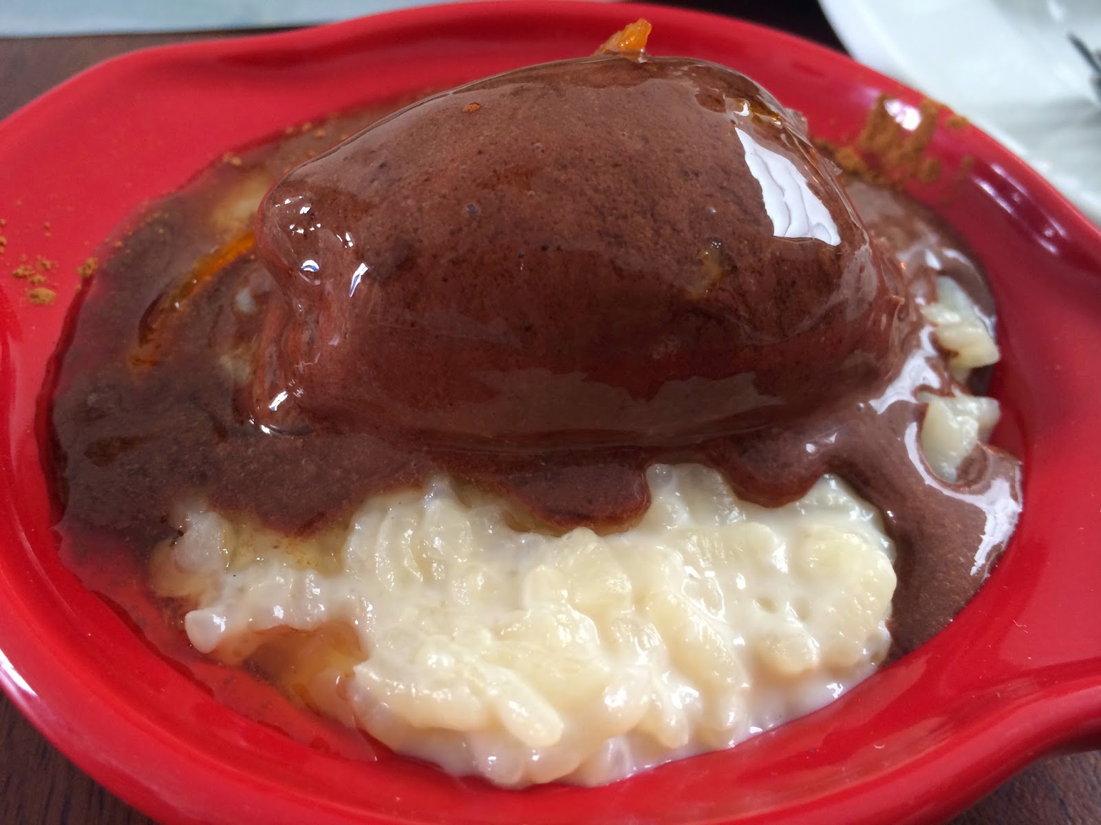 Cremoso de arroz con leche con helado de chocolate y naranja