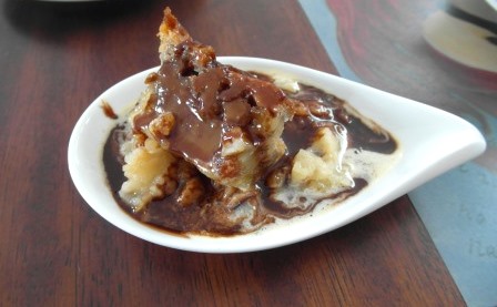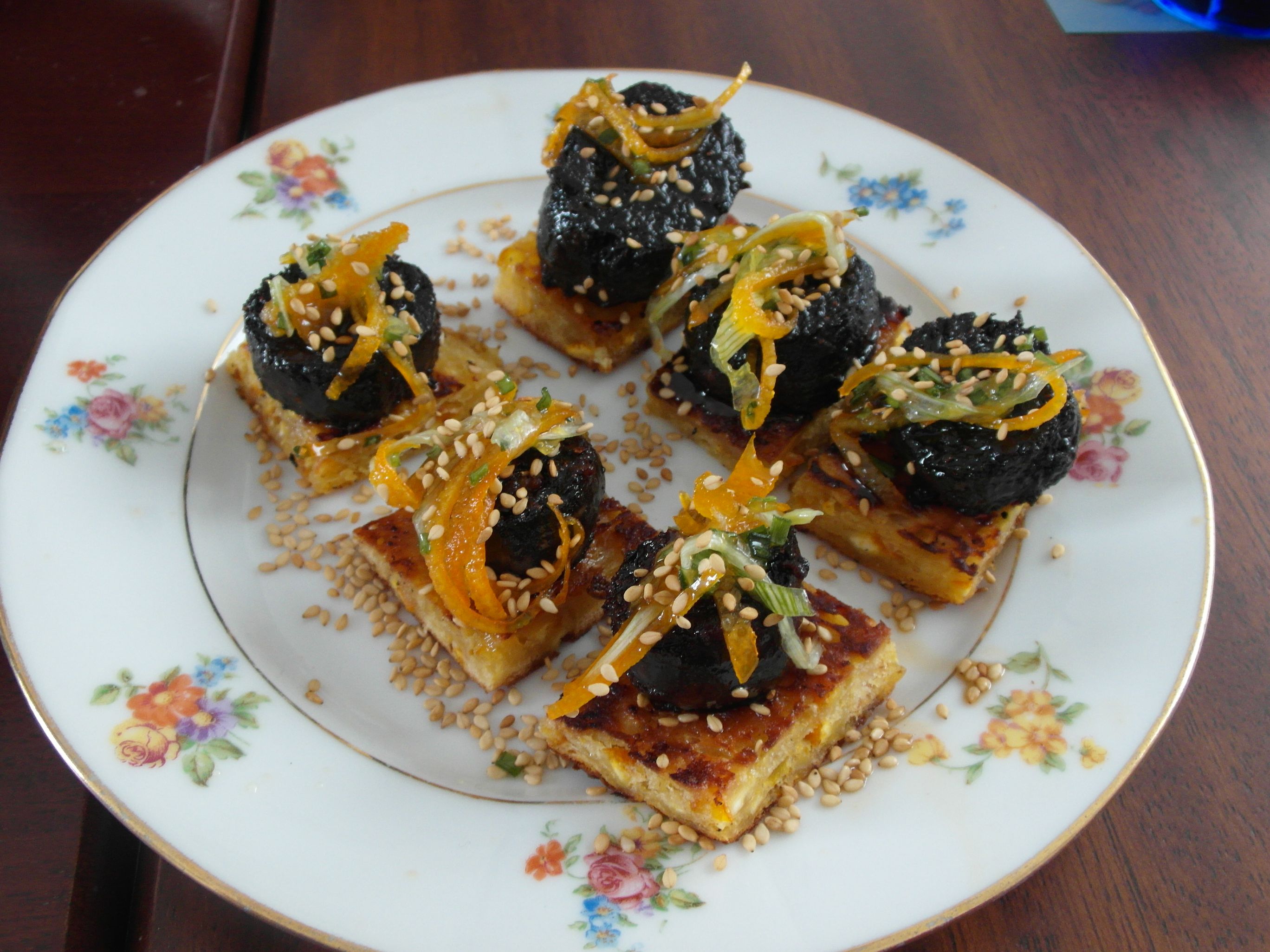 Paco nos ofreció un bocado espectacular, por lo original y buenísimo que estaba, Morcilla sobre coca de naranja y virutas de cebolleta y naranjas confitadas.
